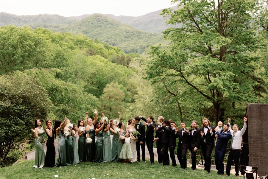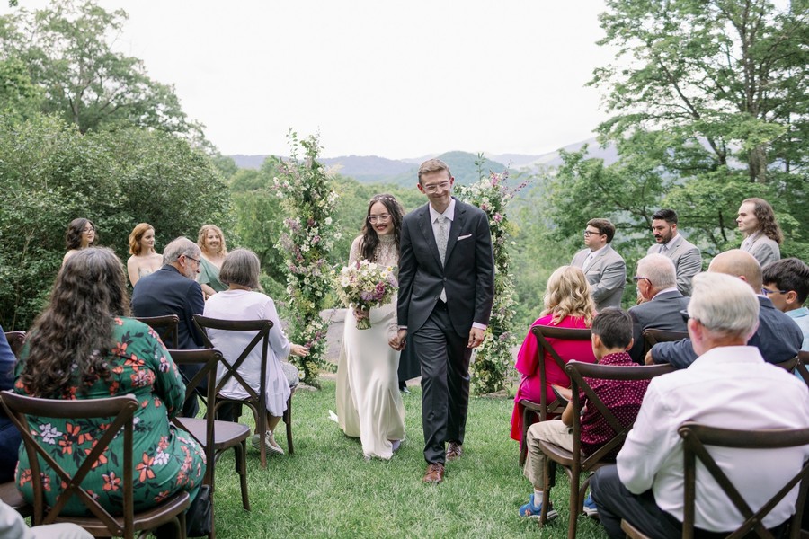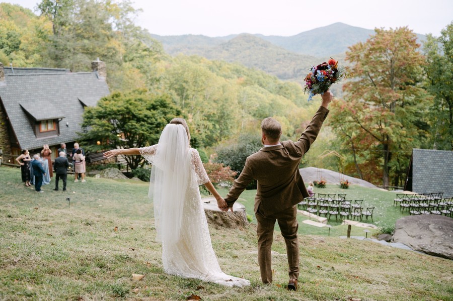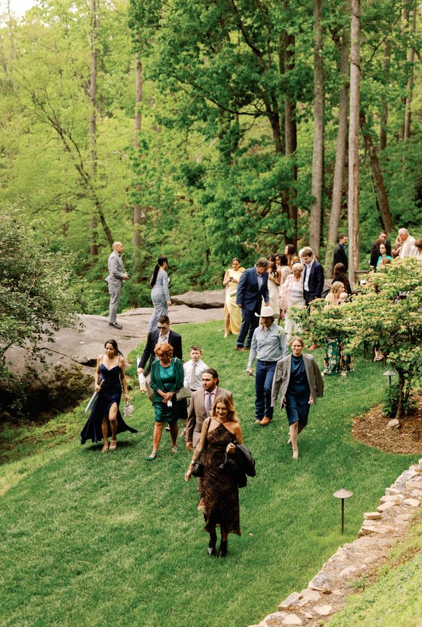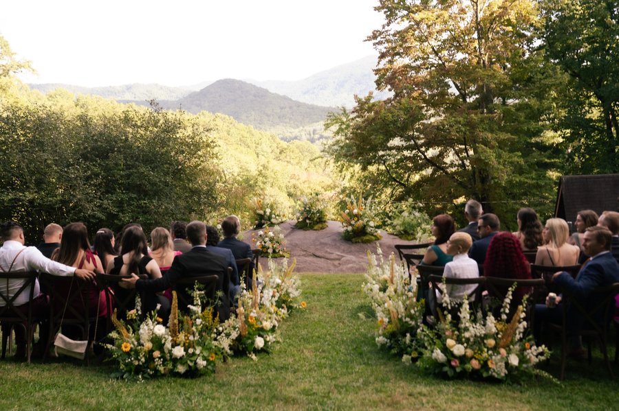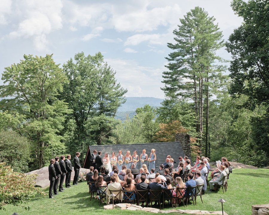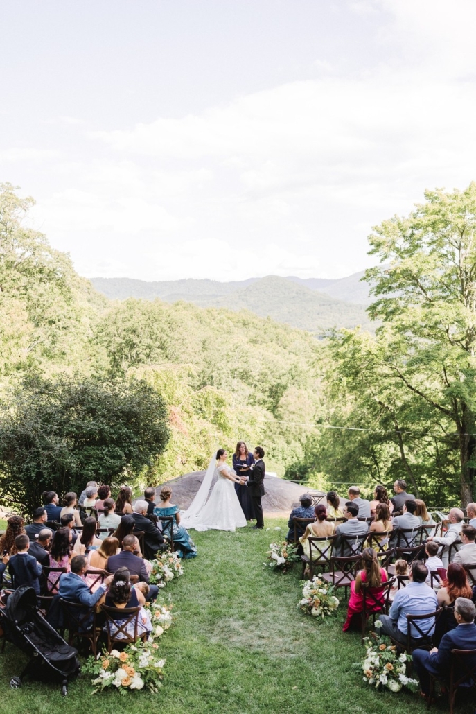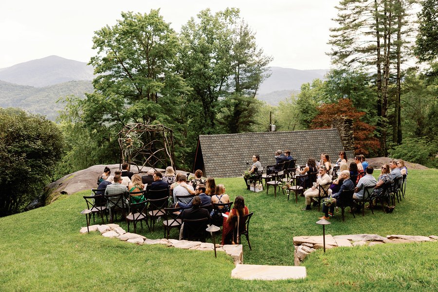 a flat grassy lawn on top of a large boulder. a lovely ceremony site with views of the mountains. a covered event pavilion overlooks the lawn and mountain view, and stairs lead down to the house.