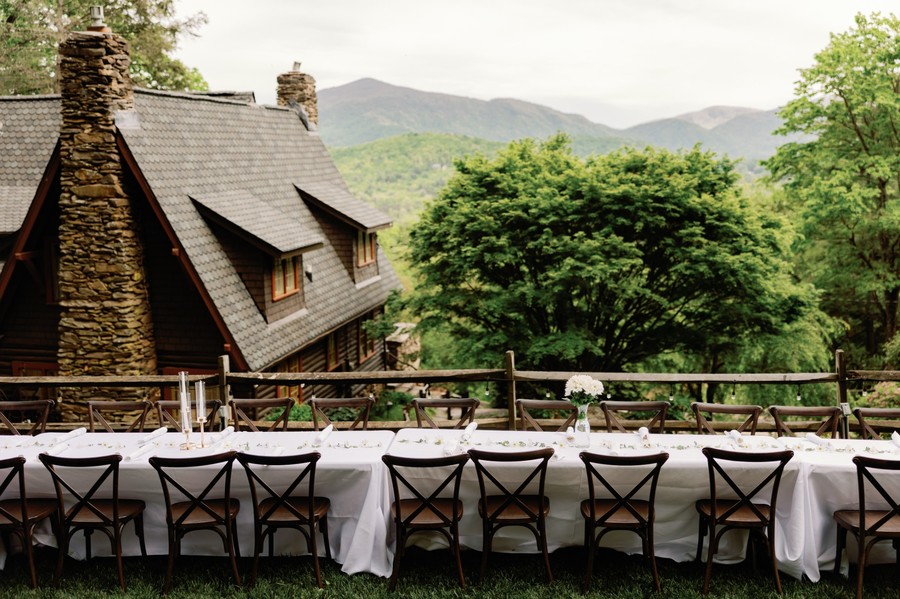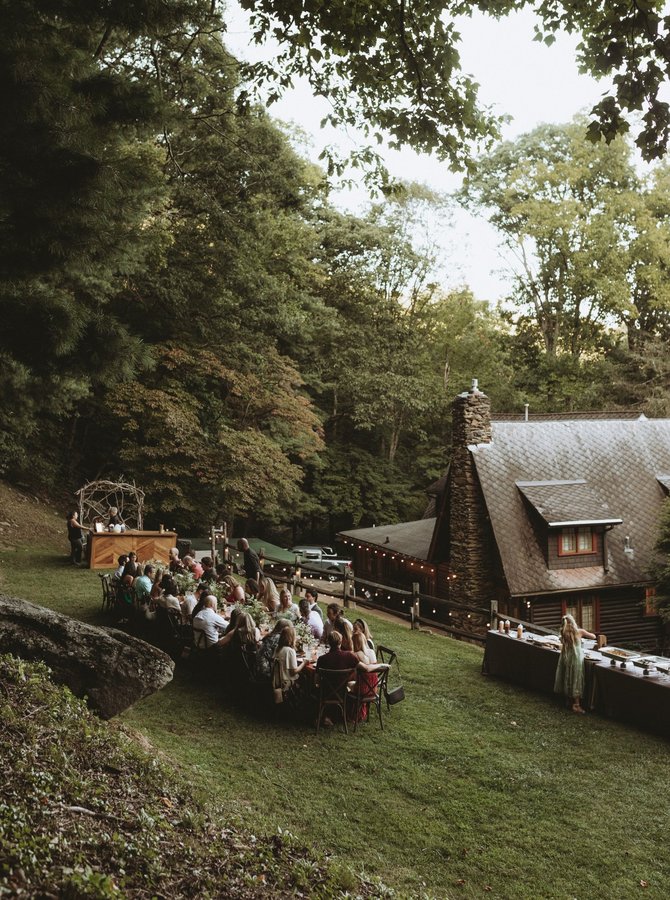 a flat grassy lawn with steps up from the house to ample seating and views of the mountains. directly adjacent to the ceremony rock and entertainment pavilion.